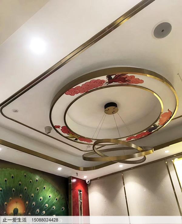 这款不锈钢造型线条吊顶与整个家装风格相一致,青古铜色,低调沉稳的气质呼之欲出。双层不锈钢线条设计,层次分明,搭配与之风格匹配的简约吊灯,诠释了一个时尚、冷傲、稳重的家居空间。